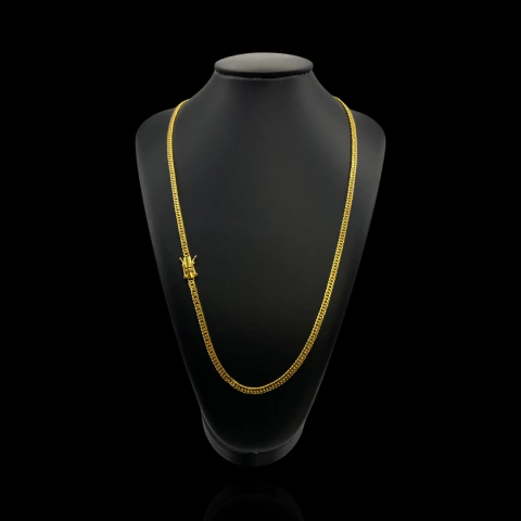 Produzido com liga metálica nobre de cobre e zinco (latão premium), o cordão recebe banho de 3 milésimos de ouro 18K legítimo por grama, garantindo coloração viva, brilho intenso e acabamento luxuoso. A aplicação do verniz cataforético antialérgico assegura alta resistência à água, suor e maresia, mantendo a aparência de nova por muito mais tempo.